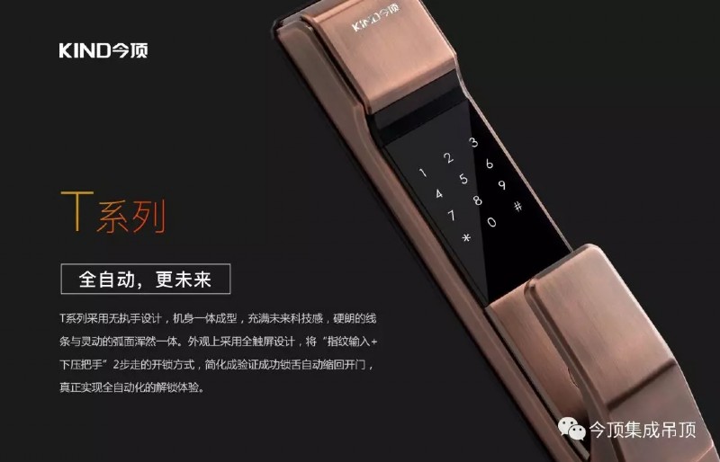 今顶 T 系列智能锁操作面板与把手呈适度夹角,巧妙融合了人体设计工学,推拉式结构顺应用户直觉操作,以舒适的持握感获得完美的开门体验,抛弃传统电子锁五金产品外观,老旧无序设计。