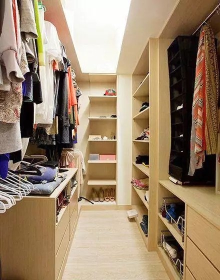 开放式衣帽间适合在一个大空间内解决所有功能,利用一面空墙存放,不完全封闭。