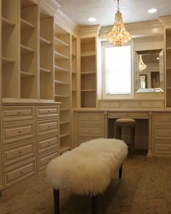 独立式衣帽间储存空间完整,但是对住宅面积要求较高,要求房间内照明充足。这种就是从小女孩们看电影时,女主角拥有的那种衣帽间啊!心爱的衣服、鞋子、包包摆放整齐,公主风的梳妆台上化妆品、饰品精致而优雅,这一方小小天地简直满足了爱美女生的所有幻想。