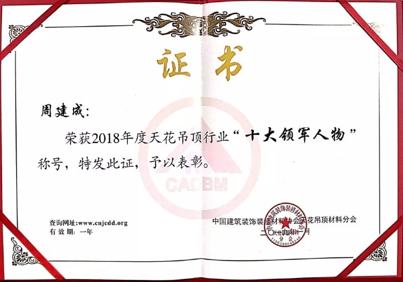 今顶董事长周建成先生当选2018年度天花吊顶行业十大领军人物