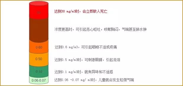 据公开资料显示:甲醛浓度在每立方米空气中达到0.08~0.09mg/m时,儿童会发生轻微气喘;达到0.6mg/m,可引起成人咽喉不适或疼痛。浓度更高的时候,会引起恶心呕吐,咳嗽胸闷,气喘甚至肺水肿;达到30mg/m时,会立即致人死亡。