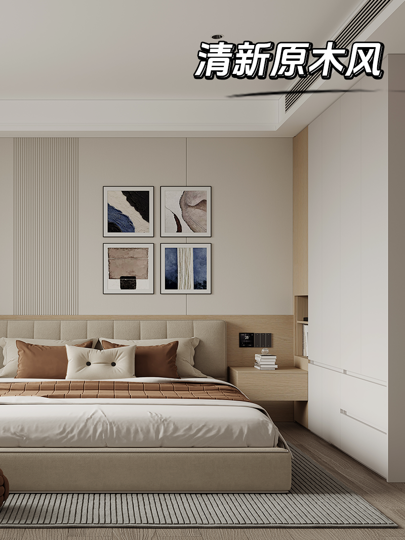 满墙衣柜采用通体凝霜白,温柔治愈的大面积白色系让整个卧室更显明亮,温馨。再以一组卡地亚黄橡床头柜进行点缀,大气自然的高级气息油然而生。